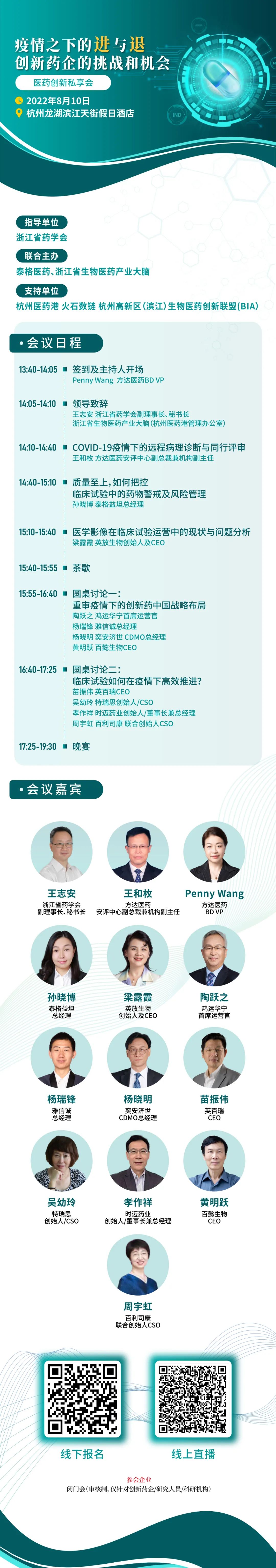 8月10日,由浙江省药学会作指导单位,泰格医药及浙江省生物医药产业大脑联合举办,杭州医药港、火石数链及BIA联盟共同支持的“疫情之下的进与退,创新药企的挑战和机会”医药创新私享会将在杭州龙湖滨江天街假日酒店举办。创新药企负责人、药政法规事务专家、新药审评专家等多位行业大咖齐聚,共同分享真知灼见。本次会议采取“线上+线下”相结合的形式,由火石数链提供全程同步直播,欢迎大家报名参加。