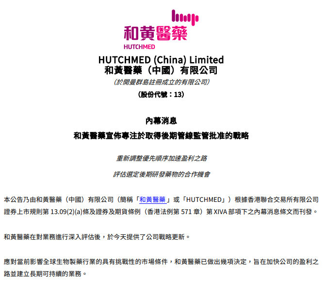 近日,和黄医药发布公告称,为应对当前影响全球生物制药行业具有挑战性的市场条件,公司正在积极进行战略转变,专注于其内部开发管线中最前沿的、最有可能推动近期价值的药物。