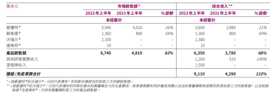 受呋喹替尼、索凡替尼和赛沃替尼等3款自主研发肿瘤创新药的商业化稳定推动,和黄医药肿瘤及免疫业务2022年上半年综合收入增长113%至9110万美元(约合人民币65027万元),上述3款创新药占比超八成。