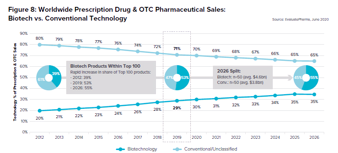 根据Evaluate Pharma的数据统计和预测,全球药品销售额Top100产品中,生物药占比提升明显,并且预计至2026年Top100药品中55%的销售额将来自于生物药。