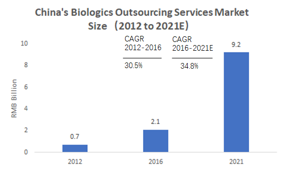 2012年至2016年,中国生物药CDMO/CMO市场预期由0.7亿RMB增至2.1亿RMB,复合年增长率为30.5%;2016年至2021年,其市场预期则由2.1亿RMB增至9.2亿RMB,复合增长率高达34.8%,呈现超高速增长的趋势。