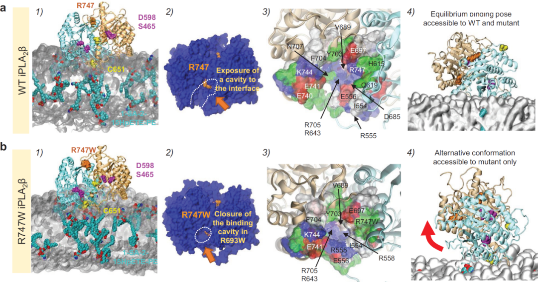 为理解突变导致iPLA2β功能缺失的机制,进一步采用计算机模拟iPLA2β WT和R747W二聚体与细胞膜磷脂的相互作用