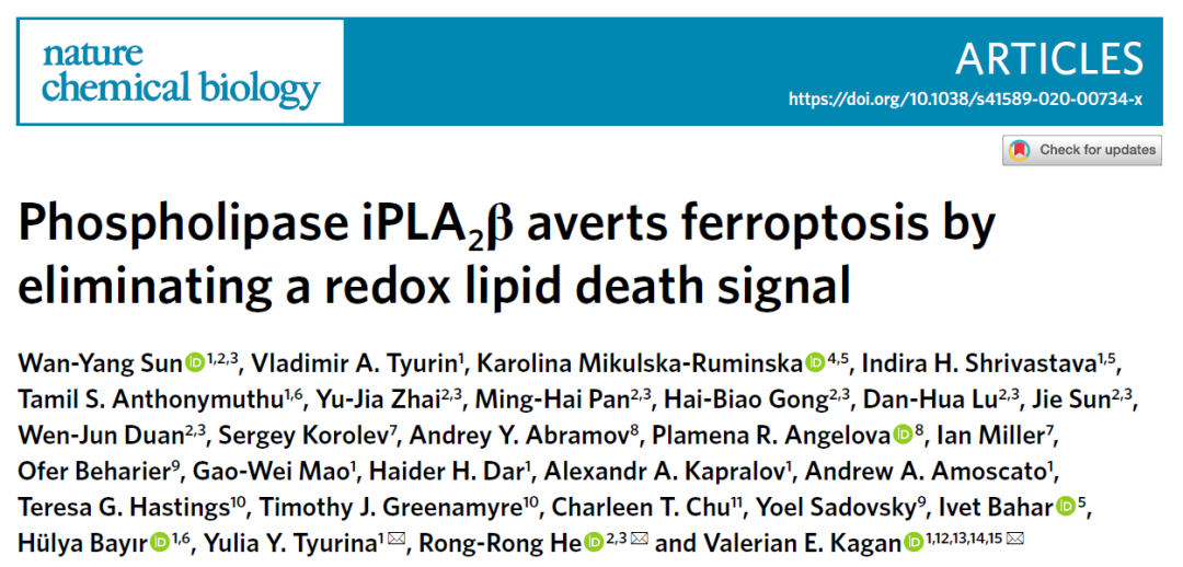 “Phospholipase iPLA2β Averts Ferroptosis By Eliminating A Redox Lipid Death Signal”的研究工作。该研究利用氧化脂质组学等技术阐明了磷脂重塑关键蛋白iPLA2β突变导致其水解氧化磷脂ox-PE活力下降,导致多巴胺能神经元中氧化磷脂堆积。