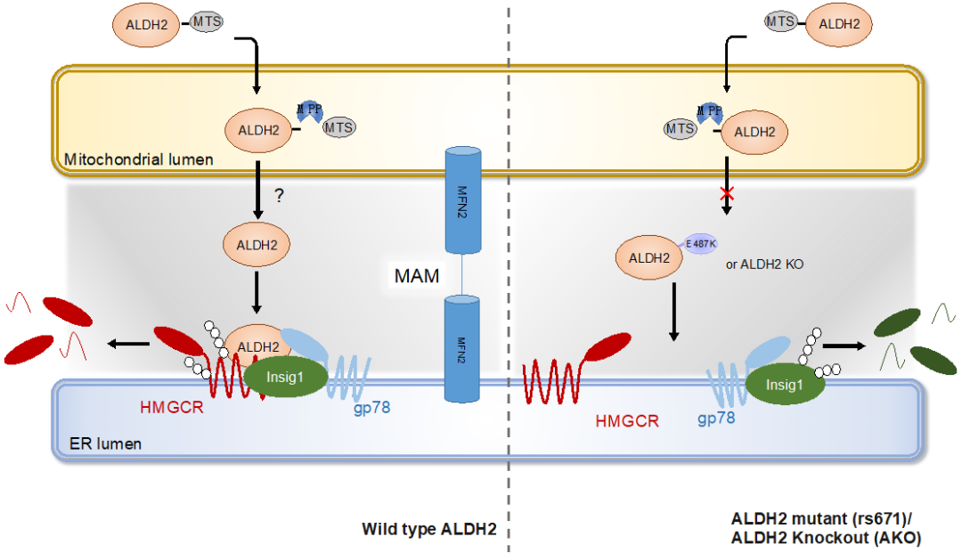 在细胞实验中, 研究人员发现ALDH2直接影响HMGCR的泛素化降解:ALDH2促进HMGCR与Insig1/SCAP/gp78的相互作用,抑制胆固醇合成,这种作用在ALDH2突变体中显著减弱。进一步的机制研究显示,在胆固醇升高时,线粒体的ALDH2通过线粒体与内质网接触的膜结构