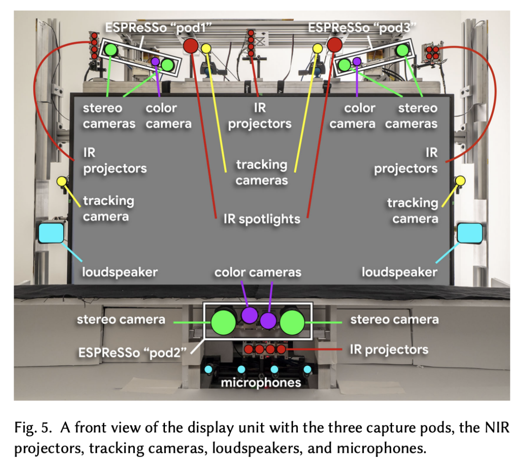 根据谷歌给出的技术图,这一套设备包括:一个包含显示器、摄像头、扬声器、麦克风、照明器和计算机的显示单元,和包含红外背光并用作bench seat的背光单元。两个单元都包含向墙壁和天花板倾斜的白色LED灯条,用于产生柔和的反射照明。