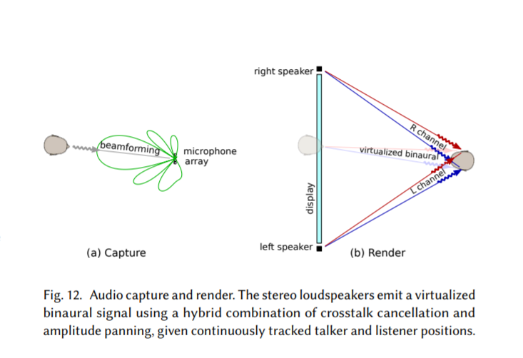 这套系统使用了talker-tracked波束成形、混响消减、WebRTC传输、talker/listener-tracked虚拟音频合成、双耳串扰消除分频组合、振幅平移、空间化音频和动态波束成形等技术。