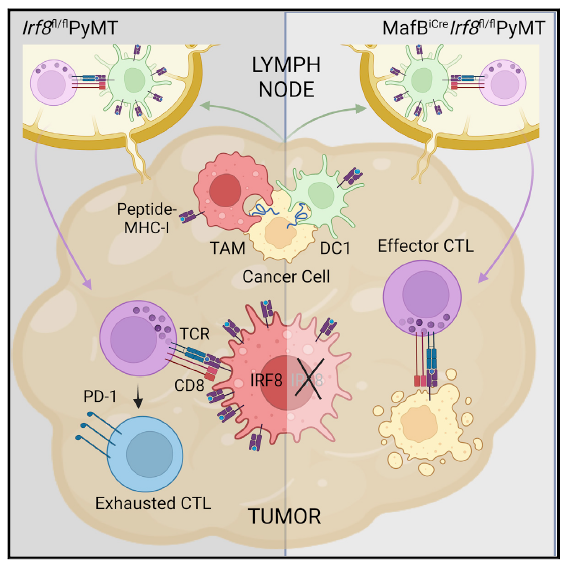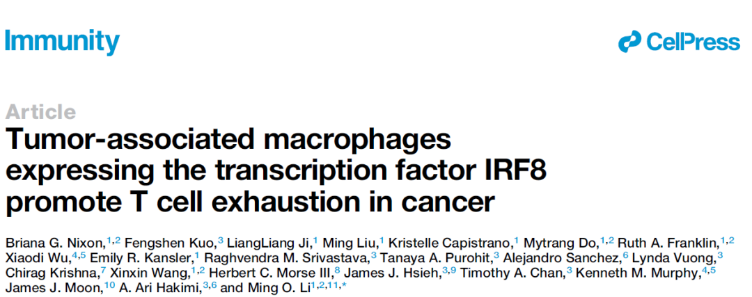揭示了肿瘤相关巨噬细胞受到IRF8调控,产生DC样特点,递呈肿瘤抗原促进CD8+T细胞功能耗竭。