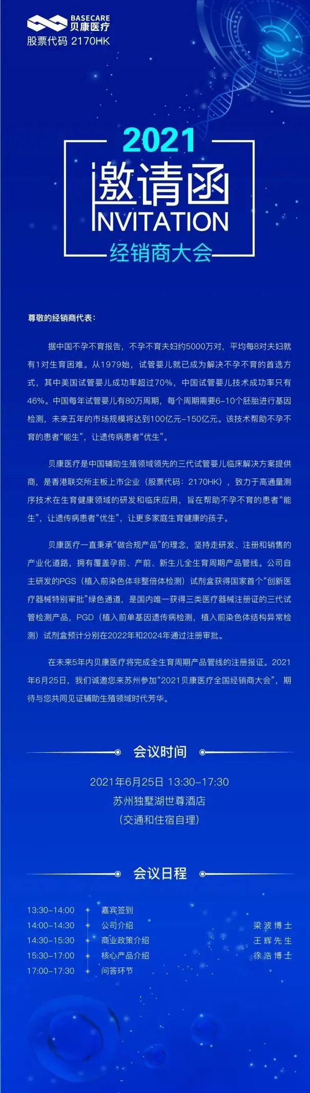 苏州贝康医疗股份有限公司将于2021年6月25日召开2021贝康医疗全国经销商大会,诚邀致力于辅助生殖领域试剂和设备的经销商前来参会。贝康医疗是中国辅助生殖领域领先的三代试管婴儿临床解决方案提供商,是香港联交所主板上市企业(股票代码:2170HK),致力于高通量测序技术在生育健康领域的研发和临床应用,旨在帮助不孕不育的患者“能生”,让携带家族遗传病基因的患者“优生”,让更多家庭生育健康的孩子。