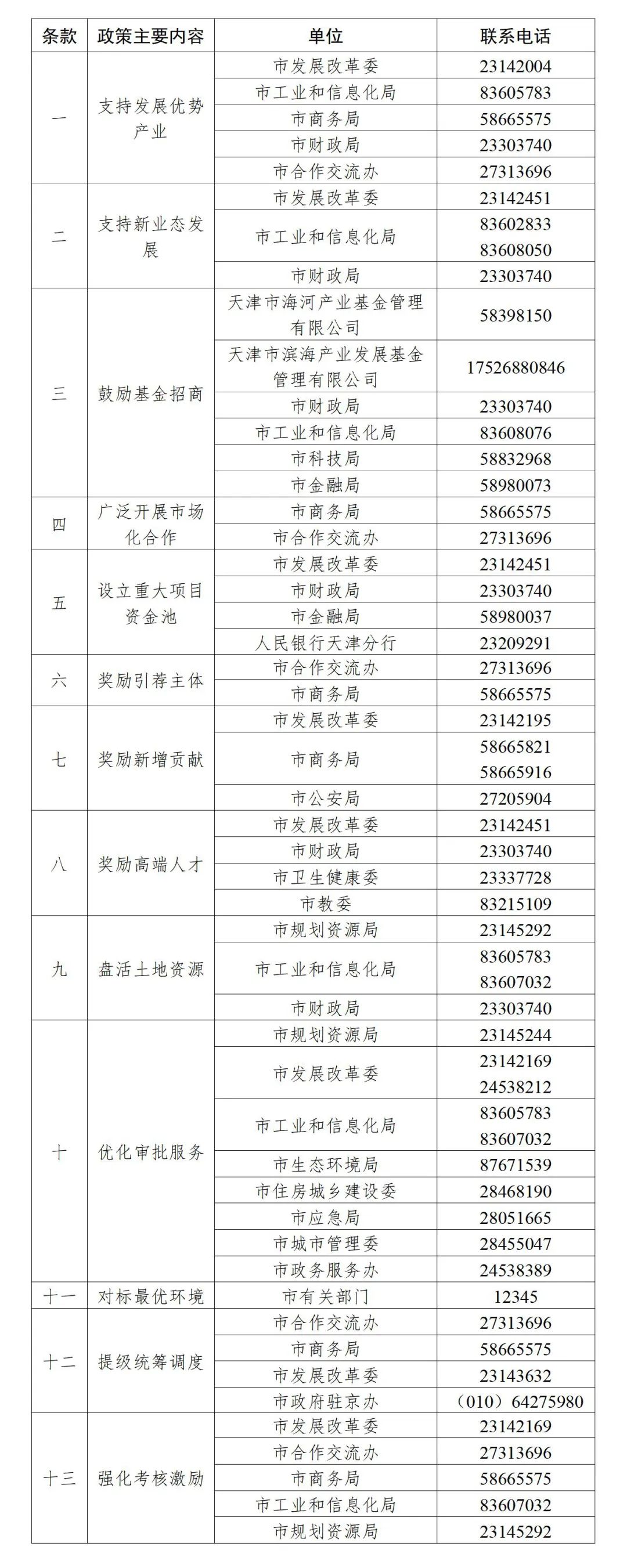 为切实做好《天津市促进招商引资扩大社会投资若干措施(暂行)》政策解读,现公布具体政策条款涉及单位的咨询联络方式,接受企业、单位来电咨询。