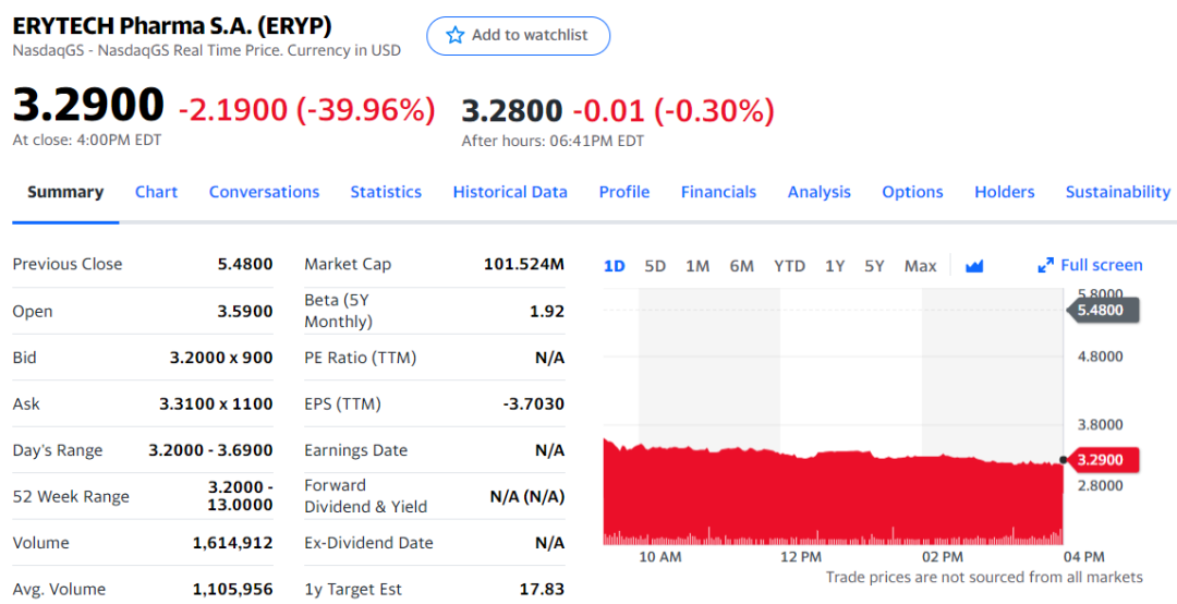 2021年10月25日,纳斯达克和泛欧交易所上市公司ERYTECH Pharma宣布了其三期TRYbeCA-1临床试验的最终结果,该试验评估了eryaspase作为二线治疗胰腺癌的512例转移性胰腺癌患者的疗效,试验未达到总生存期(OS)的主要终点。ERYTECH Pharma股价收盘暴跌40%,对于biotech公司管线就是生命。