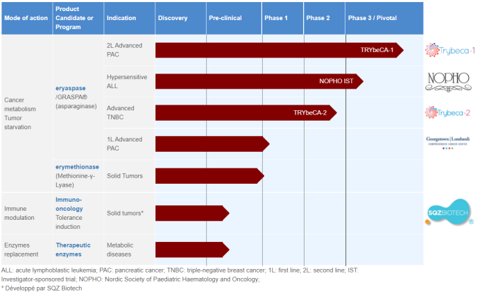 该公司的主要候选产品eryaspase由封装在供体来源的红细胞内的L-天冬酰胺酶组成,针对癌细胞改变的天冬酰胺和谷氨酰胺代谢。在急性淋巴细胞白血病 (ALL) 和胰腺癌的不同试验中建立了eryaspase 作为癌症代谢剂的概念证明。