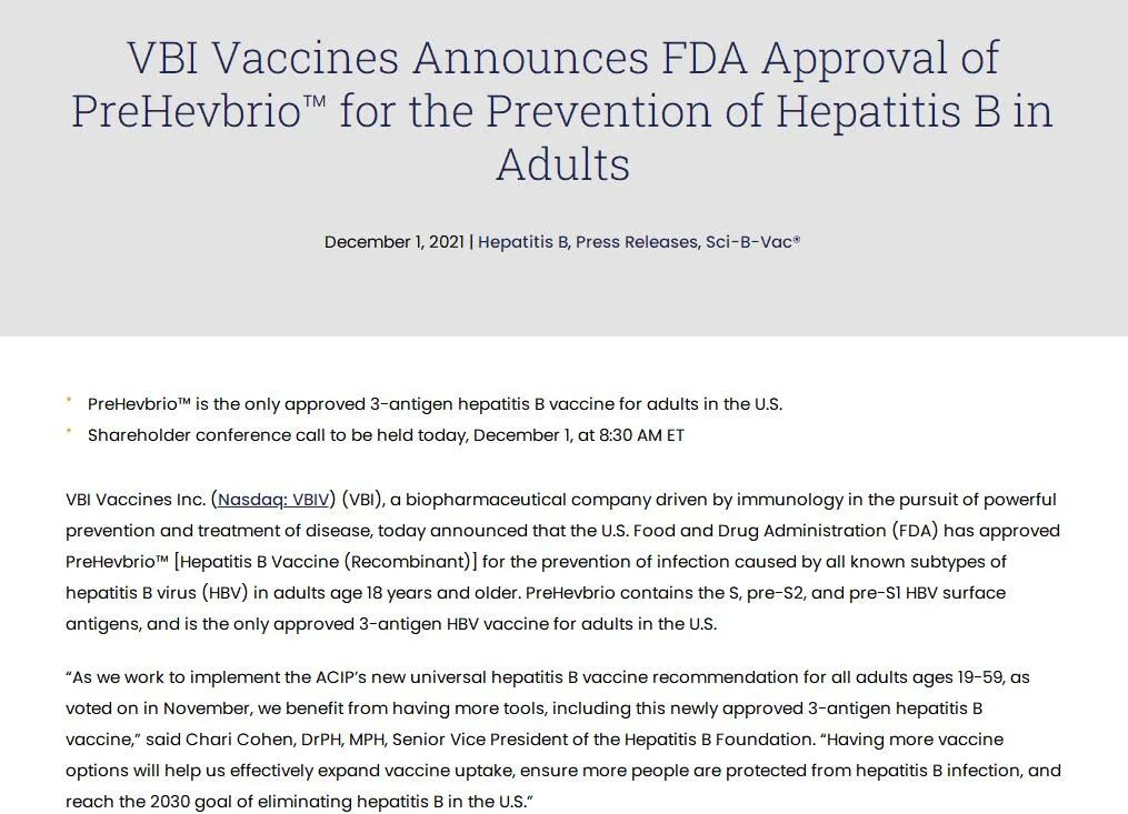 12月1日,VBI Vaccines公司宣布,美国食品药物监督管理局(FDA) 已批准乙型肝炎疫苗(重组)PreHevbrio,用于预防 18 岁及以上成人由所有已知乙型肝炎病毒 (HBV) 亚型引起的感染。这是目前FDA批准的第一款靶向三种乙肝病毒抗原的成人HBV疫苗。