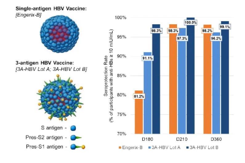 PreHevbrio是VBI Vaccines开发的第三代乙肝疫苗,它是一种含有HBV的Pre-S1,Pre-S2和S表面抗原的类病毒颗粒(VLP),具有更好的免疫原性,可在两次或三次免疫后引发强烈的血清保护作用。