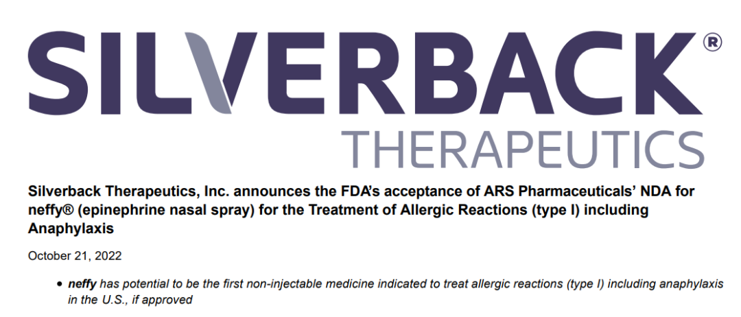 10月21日,Silverback Therapeutics宣布,FDA已接受2mg肾上腺素鼻喷雾剂neffy的新药申请(NDA)用于紧急治疗I型过敏反应,包括成人和≥30kg儿童患者的过敏反应。如果获批,neffy将成为首个用于I型过敏反应,包括过敏反应患者的非注射治疗产品。PDUFA日期为2023年年中。