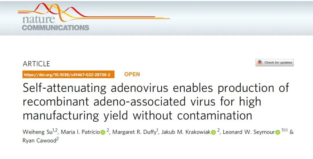 [2] Su, W., Patrício, M.I., Duffy, M.R. et al. Self-attenuating adenovirus enables production of recombinant adeno-associated virus for high manufacturing yield without contamination. Nat Commun 13, 1182 (2022). https://doi.org/10.1038/s41467-022-28738-2