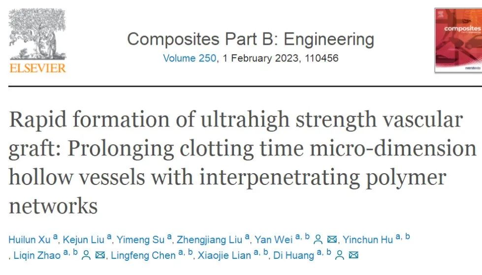最终,相关论文以《超高强度血管移植物的快速形成:具有互穿聚合物网络的微尺寸空心血管延长凝血时间》(Rapid formation of ultrahigh strength vascular graft: Prolonging clotting time micro-dimension hollow vessels with interpenetrating polymer networks)为题发表在 Composites Part B: Engineering 上 [1],徐慧伦是第一作者,太原理工大学生物医学工程学院的魏延副教授、赵丽琴副教授、黄棣教授担任共同通讯作者。