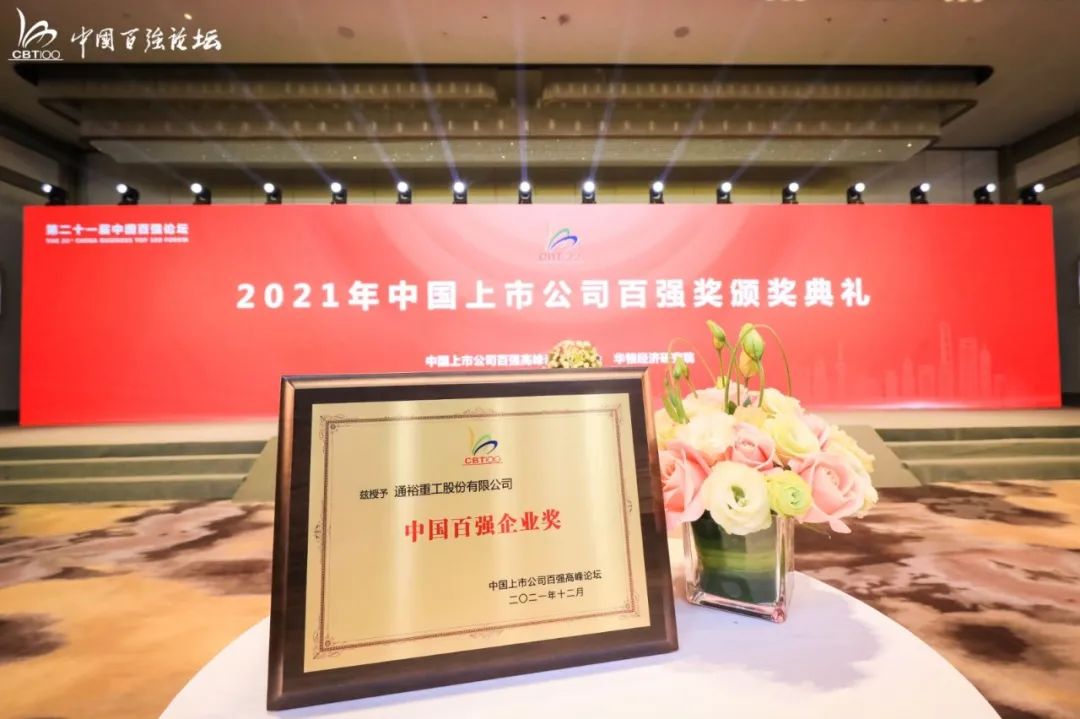 2021年12月4日,由中国上市公司百强高峰论坛组委会、华顿经济研究院主办的第二十一届中国百强论坛在上海以线上线下相结合的形式成功举办。通裕重工凭借良好的经营业绩和公司治理水平,荣获“中国百强企业奖”荣誉称号!