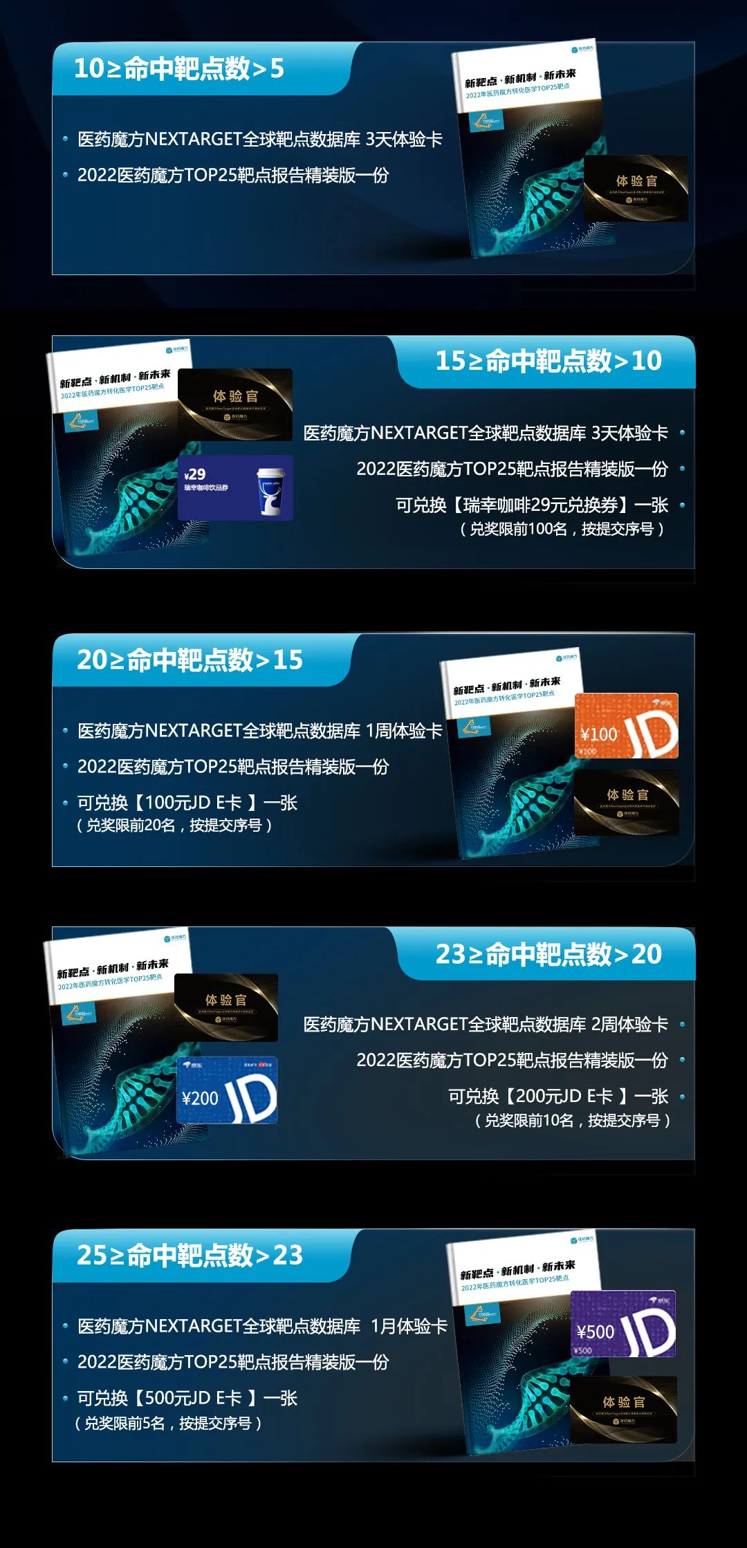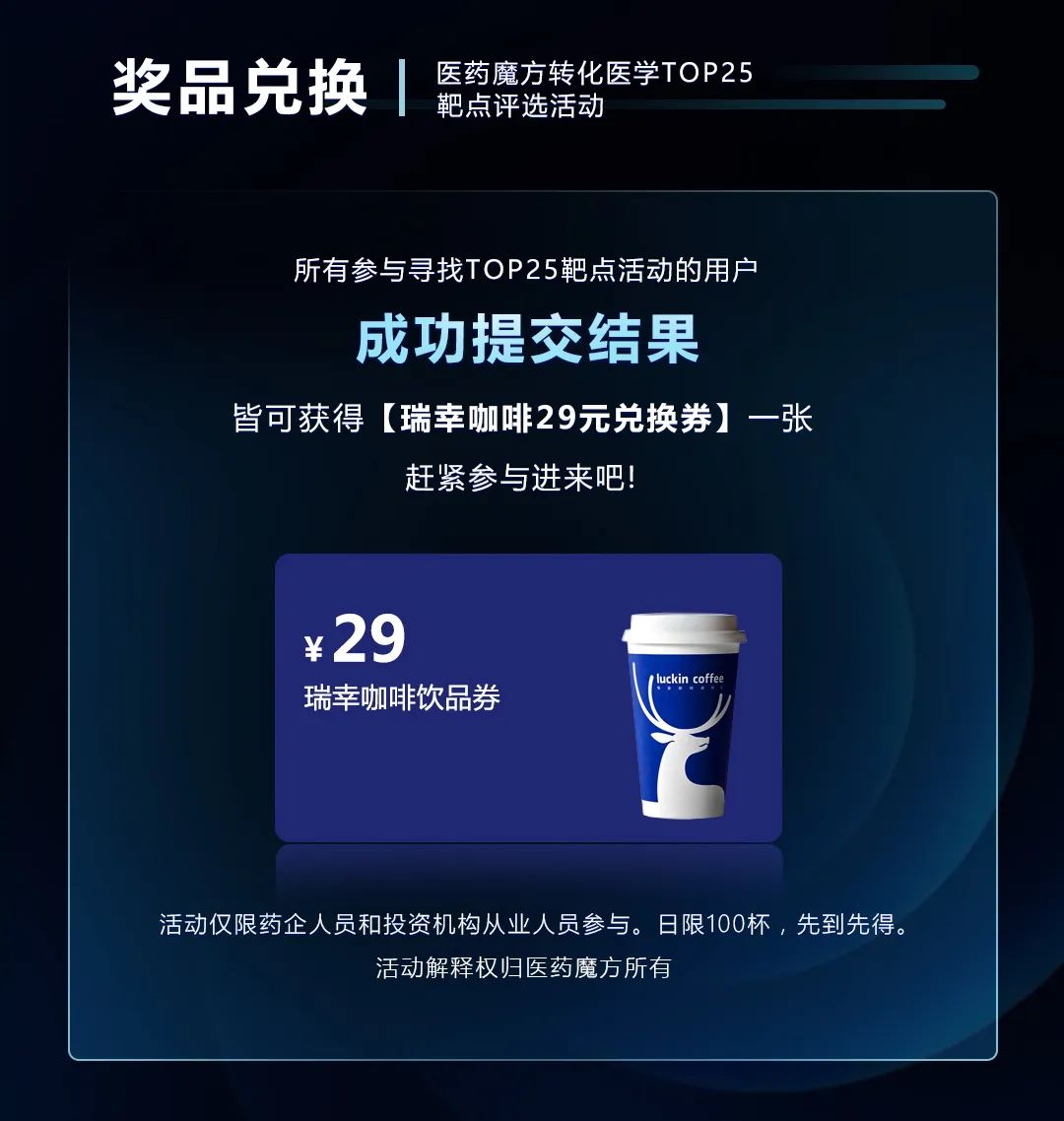 所有参与评选的用户皆可获得【瑞幸咖啡29元兑换券】一张,活动仅限医药行业相关人员参与,包含投资机构及券商从业人士。靶点数量命中越多则可获得的奖品越丰富,TOP25靶点报告、JD E卡等你抱回家。活动解释权归医药魔方所有。