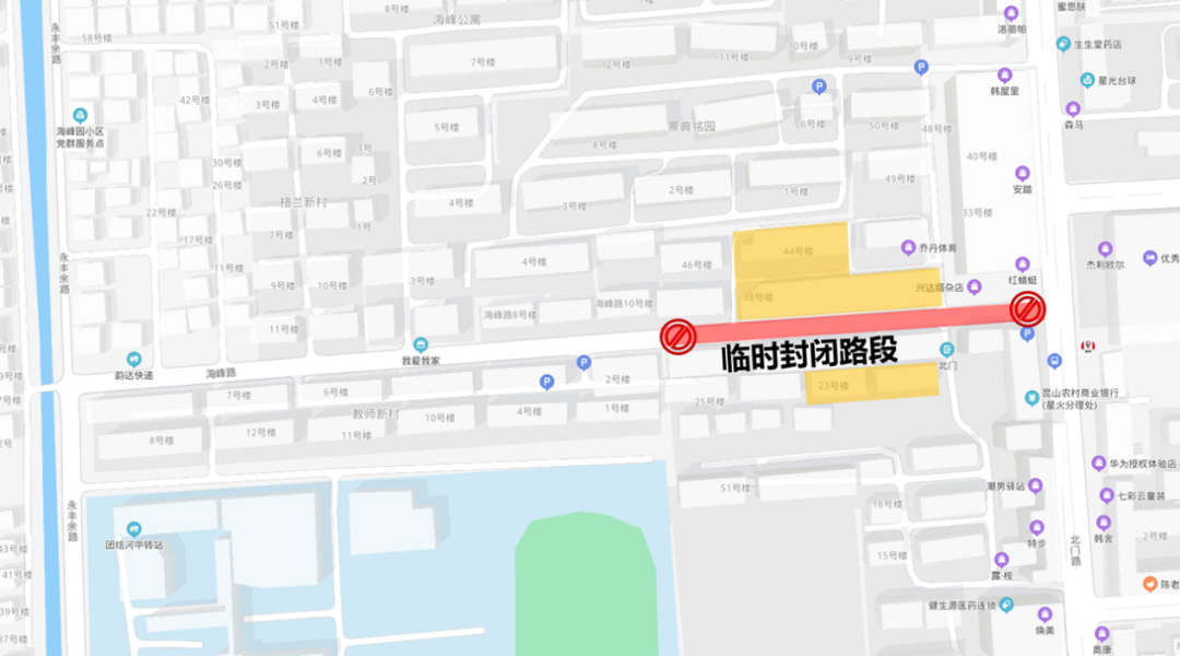 兹定于2021年11月29日开展北门新村(海峰小区)第二批次D级危房应急解危,对22#、23#、34#、35#、36#、37#、38#、43#、44#、45#楼拆除施工。为确保施工作业期间人员安全,海峰路部分路段将于当日7:00~18:00实施封闭,禁止行人、车辆通行。