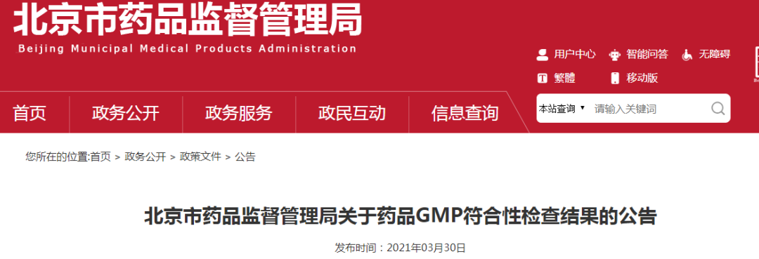 3月30日,北京市药监局发布了一则关于药品GMP符合性检查结果的公告。