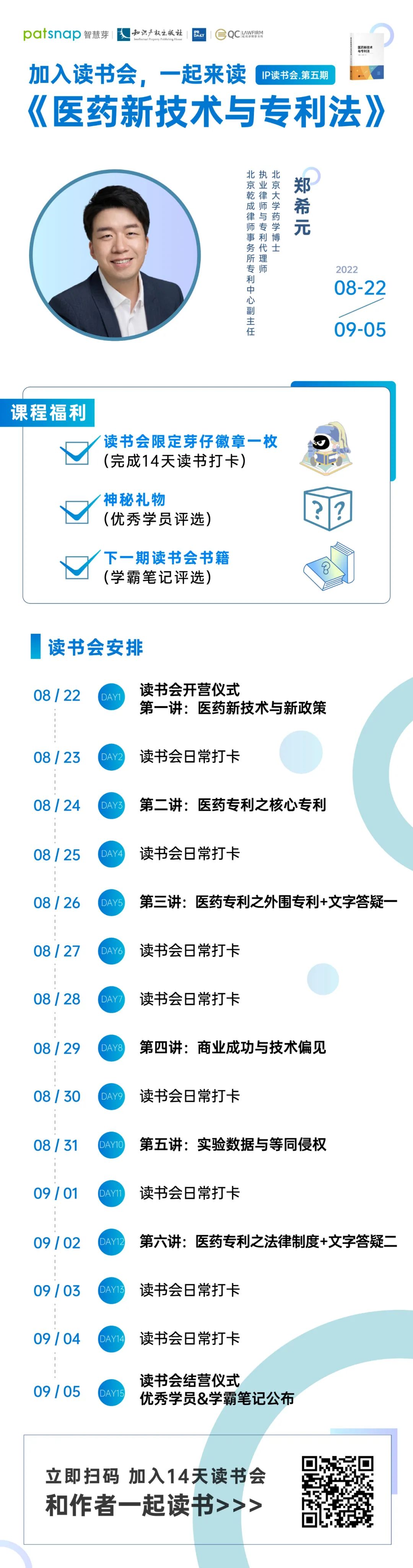 本次读书会更注重实践应用,希望能够切实地为中国医药企业、院校、以及科研院所的知识产权从业人员、商务开发人员以及药物研发人员提供帮助。同时我们将设置14天打卡活动,养成阅读习惯,赶快报名加入读书会吧!