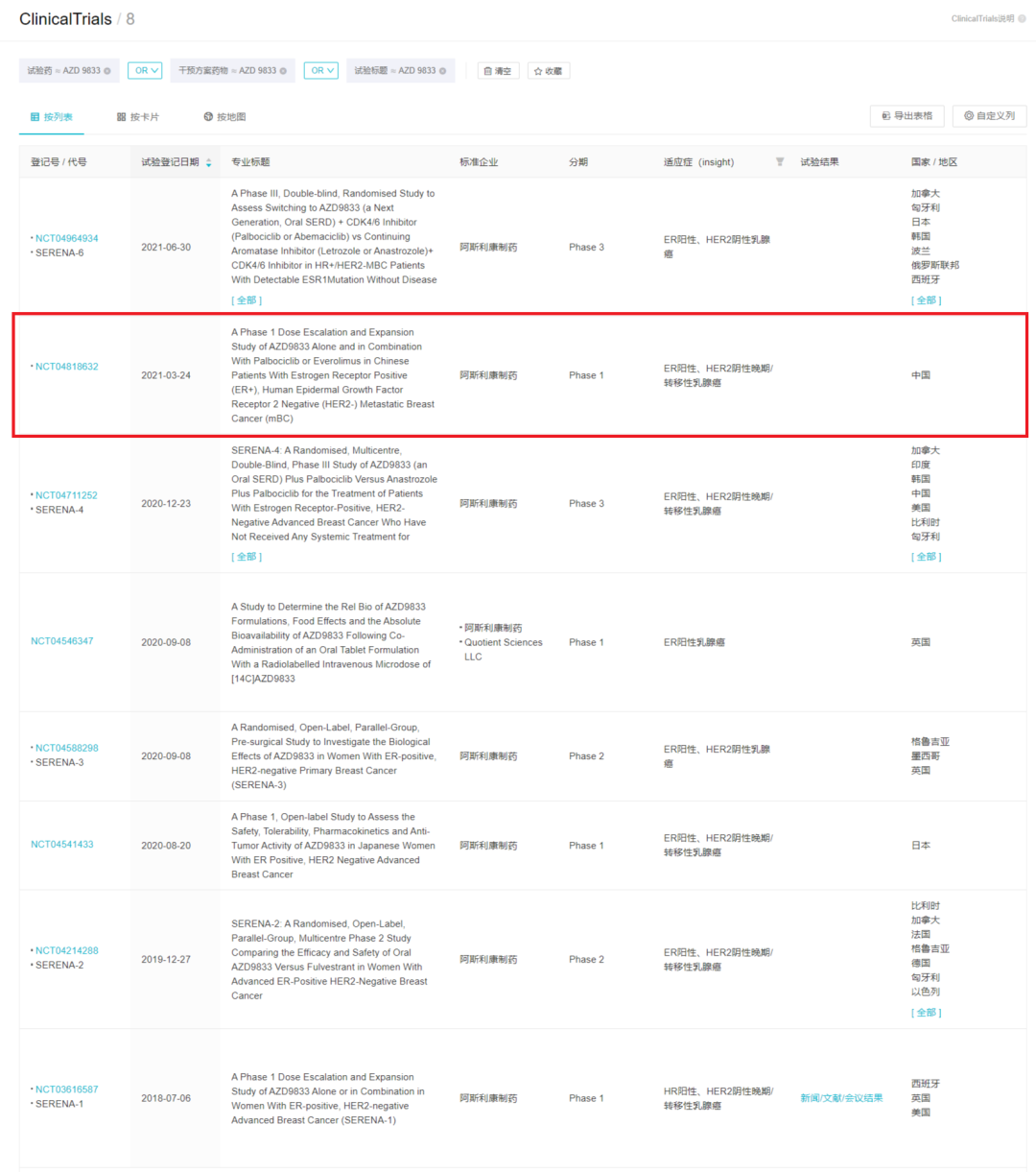 根据 Insight 数据库,AZD9833 目前在全球共 8 项临床试验正在进行中,其中包括两项 3 期临床 SERENA-4 和 SERENA-6。其中一项 1 期临床数据已经披露。