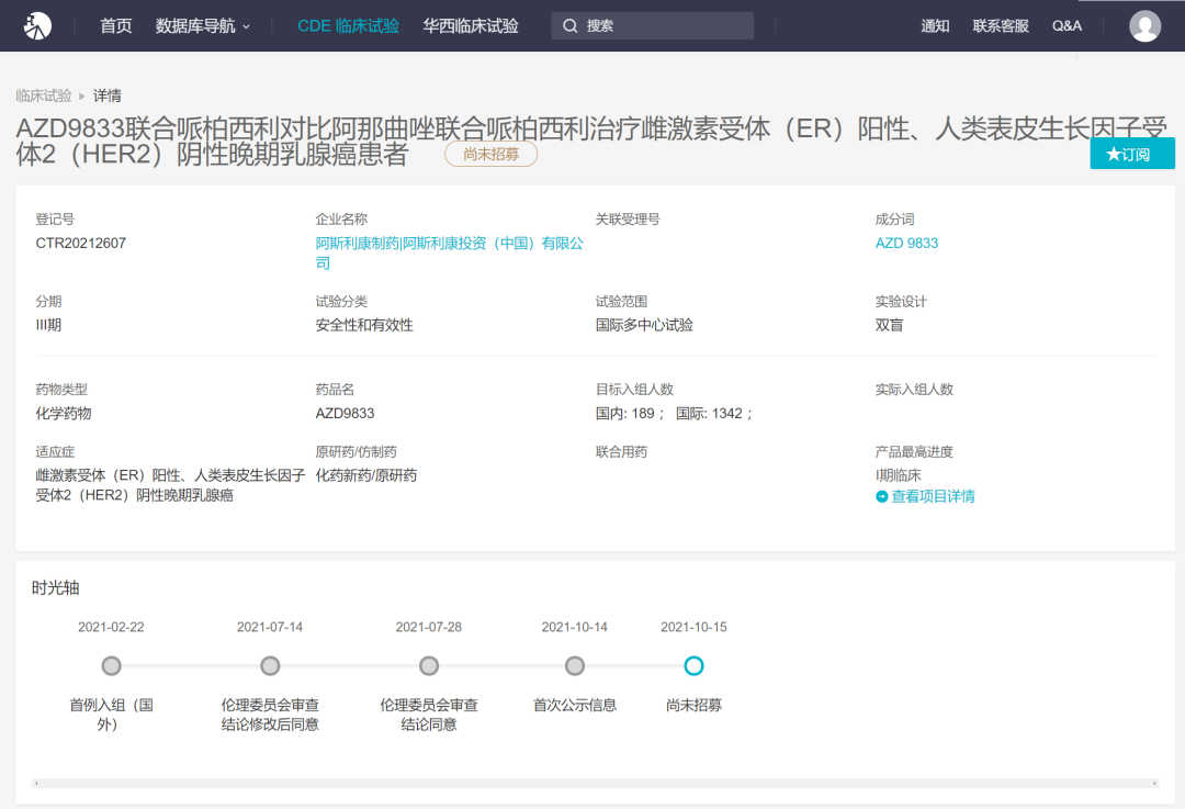 10 月 15 日,Insight 数据库显示,阿斯利康的口服雌激素受体降解剂(SERD)AZD9833 在国内启动 3 期临床。点击查看临床试验详情