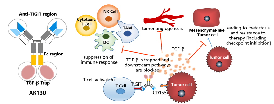 作为一种新型的融合 TGF-βRII 蛋白的 TIGIT 抗体,AK130 可抑制 TIGIT 介导的免疫抑制,同时降低 TME 中的 TGF-β 水平。通过改造 IgG4 骨架的抗体的 Fc 区,来消除抗体依赖性细胞介导的细胞毒性 (ADCC) 和补体依赖性细胞毒性 (CDC),从而将淋巴细胞损失降至最低,最终实现高效且安全性的抗肿瘤作用。