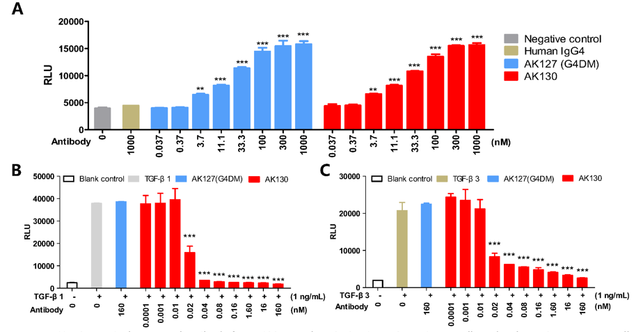 研究显示,AK130 有效阻断了 TIGIT 和 CD155 之间,以及 TGF-β1/TGF-β3 和 TGFβ-RII 之间的相互作用。