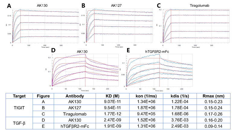 图 3. AK130 对 TIGIT 或 TGF-β 的结合活性