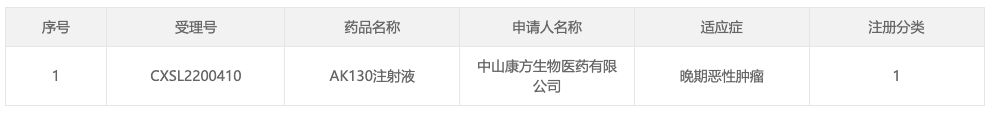 11 月 15 日,据 CDE 官网显示,康方 AK130 注射液临床试验申请获默示许可(受理号:CXSL2200410)。