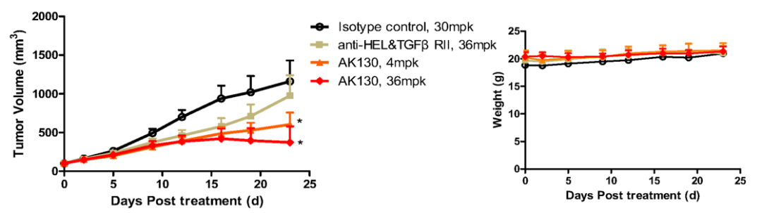 检测 AK130 针对 TIGIT 表达阳性的细胞的的 ADCC 和 CDC 的效应功能,并在植入 H22(一种小鼠肝癌细胞系)细胞的 BALB/c-hTIGIT 转基因小鼠中研究 AK130 的抗肿瘤活性。通过腹腔注射给予小鼠 AK130 或抗 HEL&TGF-βRⅡ(一种可与 TGF-β 结合但不与 TIGIT 结合的同型对照抗体),并测量小鼠肿瘤体积。