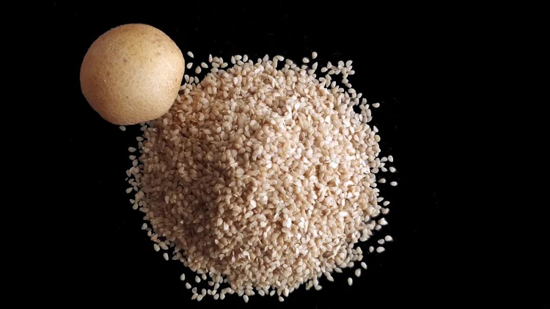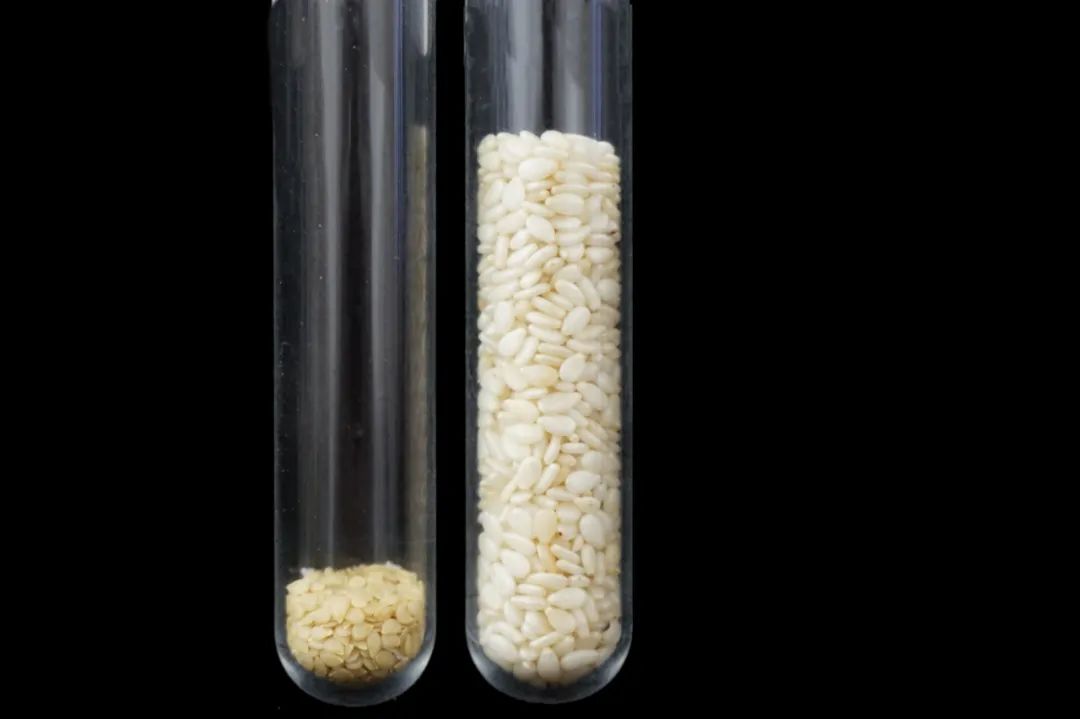 1000粒马铃薯种子(左)和1000粒芝麻(右)对比,体积比为1:6