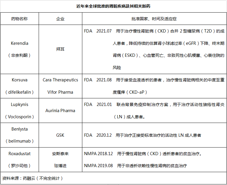 目前,企业的努力已经初见成效,近年来全球已经批准几款肾脏疾病及其相关药物,详见下表。而且,治疗2型糖尿病的药物SGLT2抑制剂Invokana(卡格列净)、Forxiga/Farxiga(达格列净)也被批准用于治疗糖尿病肾病。