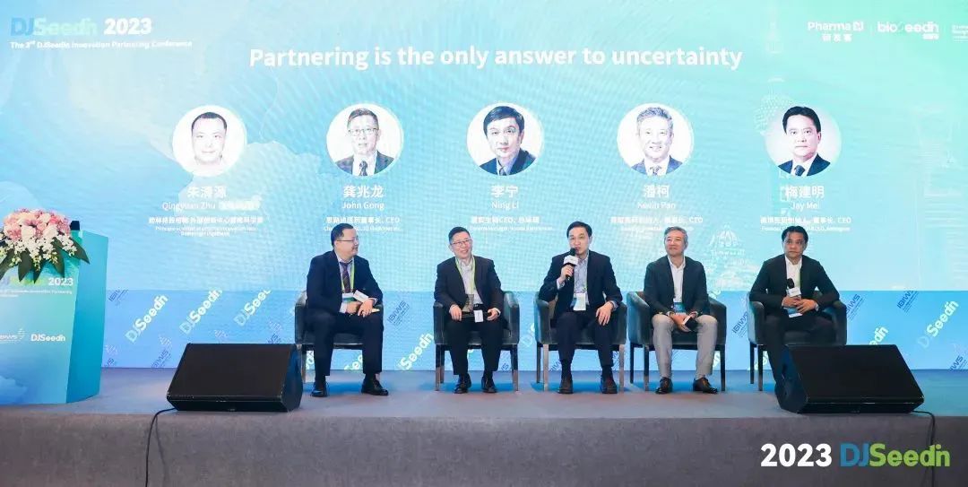 在随后的圆桌讨论环节,由勃林格殷格翰外部创新中心首席科学家朱清源主持,思路迪医药董事长、CEO龚兆龙 ,君实生物CEO、总经理李宁 ,亚虹医药董事长、CEO潘柯,德琪医药董事长、CEO梅建明共同探讨了“Partnering is the only answer to uncertainly”。