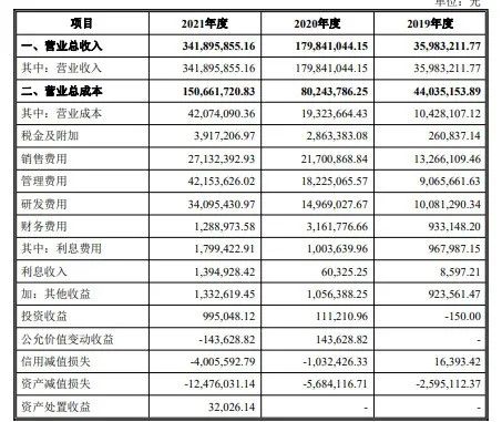 2018年至2021年,近岸蛋白营业收入分别为2600.46万元、3598.32万元、1.80亿元、3.42亿元。