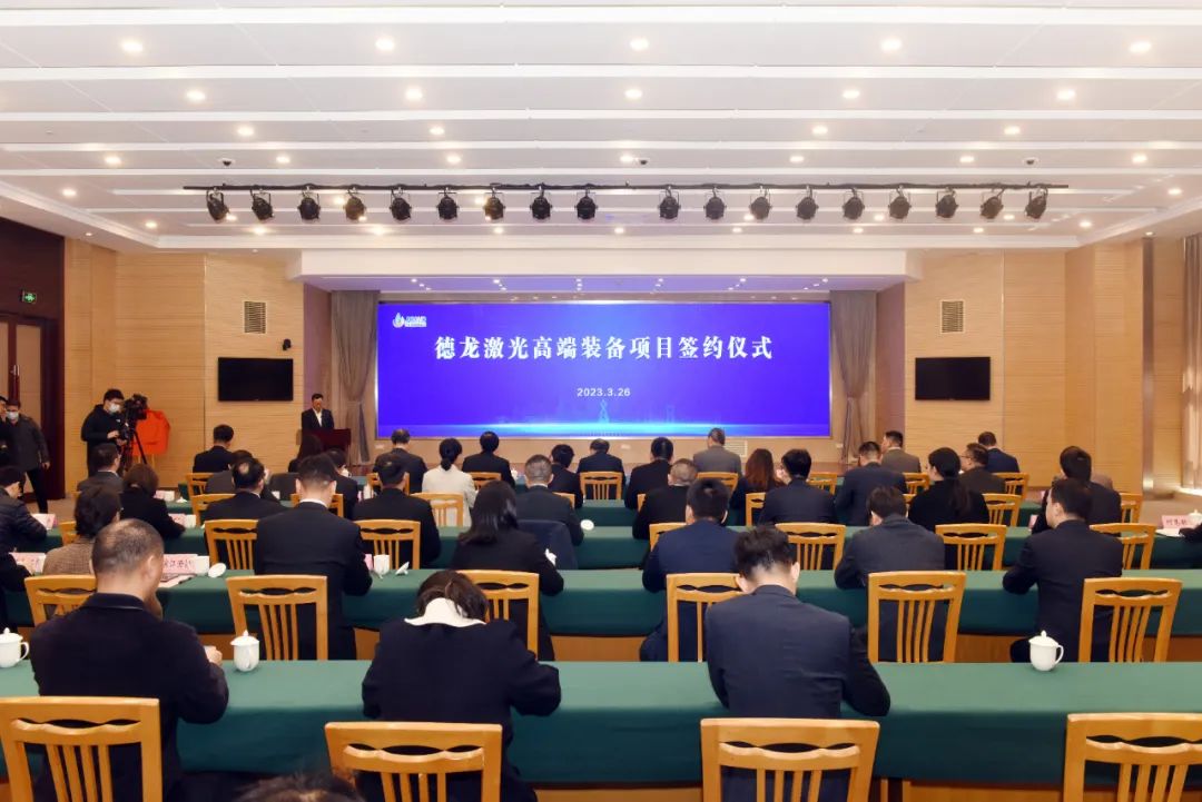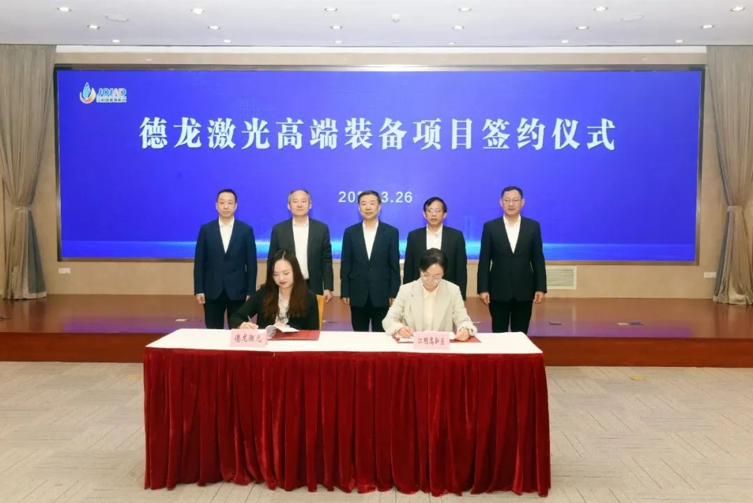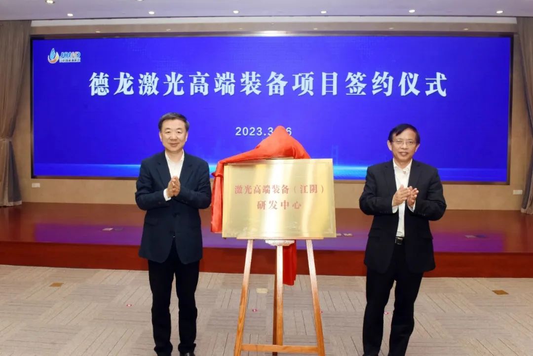3月26日上午,江阴举行德龙激光高端装备项目签约仪式。无锡市委常委、江阴市委书记许峰和苏州德龙激光股份有限公司董事长赵裕兴共同为“激光高端装备(江阴)研发中心”揭牌。市长包鸣,市领导顾文瑜、陈涵杰、郭诚,高新区领导赵志军、六扬、李满刚、陈峰参加签约仪式。