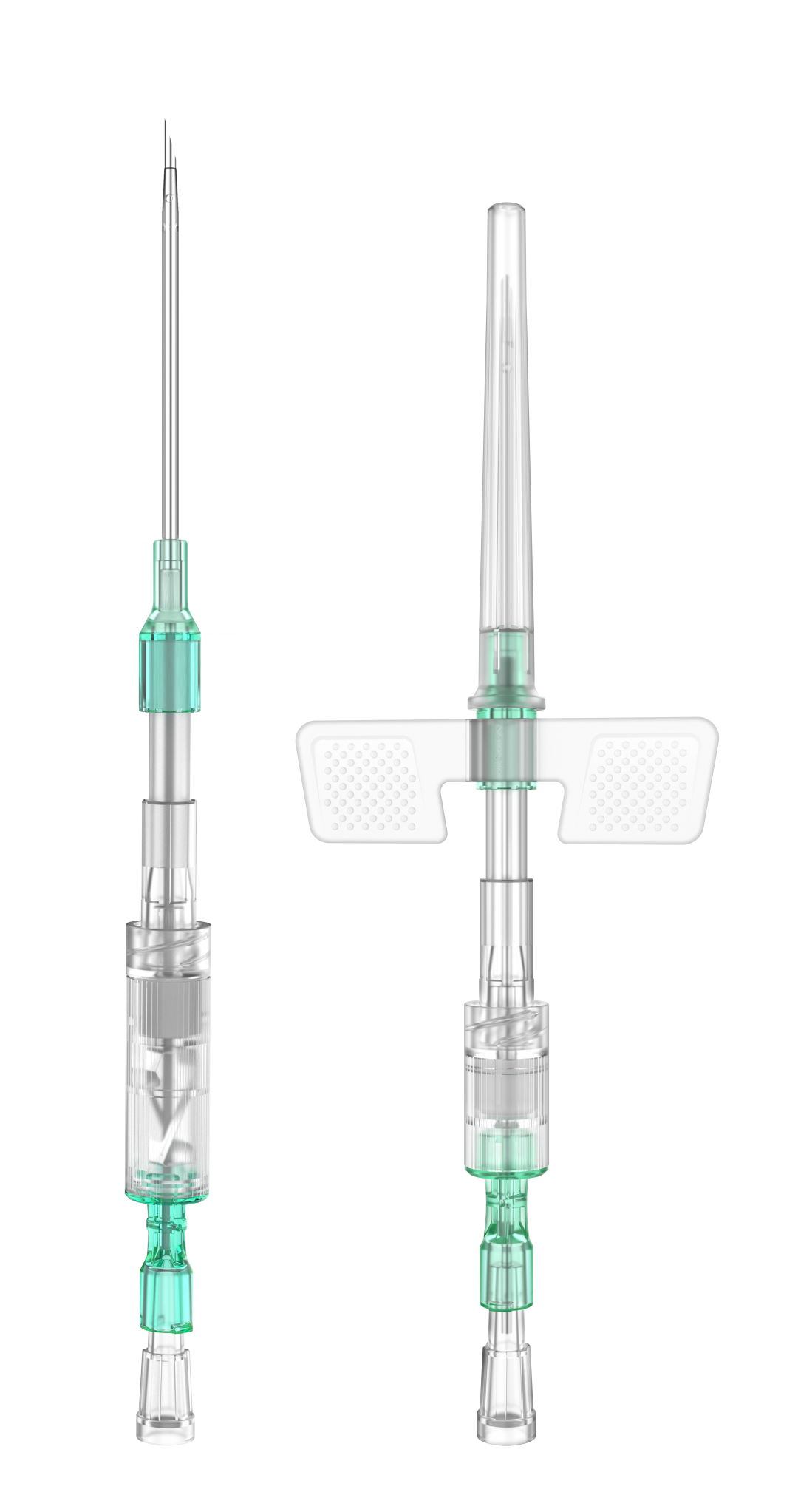 一次性使用透析用留置针由针管、导管、导管座、针芯、翼柄等组成。