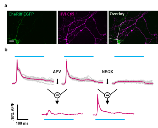 此外,实验将HVI-Cy5与光遗传学工具分别表达在培养的大鼠海马体神经元中,利用膜电位成像评估APV和NBQX两种药物对神经元突触连接的影响,解析了NMDAR和AMPAR两类谷氨酸受体对突触信号传递的贡献(图4)。未来,HVI-Cy5有望在体外筛选作用于受体蛋白的激动剂或拮抗剂。