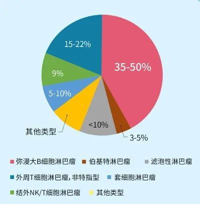 图:非霍奇金淋巴瘤的种类。弥漫型大B细胞淋巴瘤(DLBCL)是一种最常见的非霍奇金淋巴瘤,占比为35-50%。