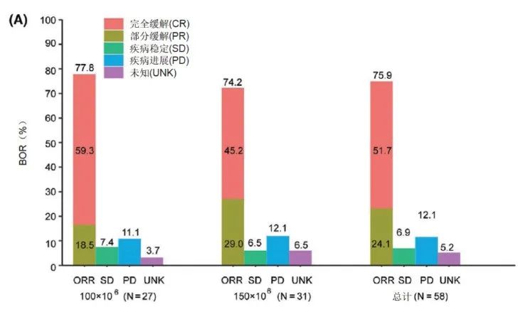 该临床试验所入组的患者中,总共有59例患者接受了瑞基奥仑赛CAR-T治疗,有58例患者可评估治疗有效性。临床试验的主要终点为治疗3个月后的客观缓解率(objective response rate,ORR)。
