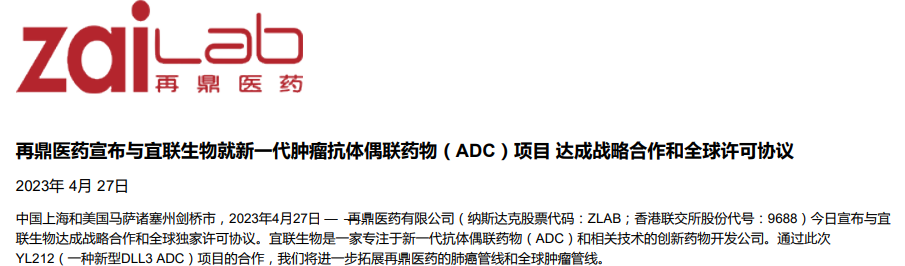 4月27日,再鼎医药宣布与宜联生物达成战略合作和全球独家许可协议。根据协议条款,再鼎医药将获得YL212的全球所有的开发和商业化活动权益,宜联生物将有权获得预付款和基于开发和销售的里程碑付款,以及全球年度净销售额的分级特许权使用费和潜在的第三方许可分成。