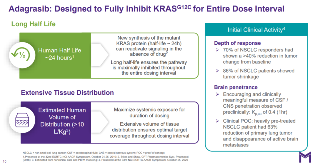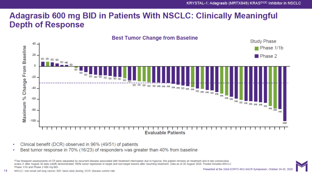 2020年10月发布了1/1b期和2期临床试验的患者数据显示,adagrasib单药治疗(剂量为600 mg,每日两次)在NSCLC患者中达到45%(23/51)的确认客观缓解率。96%(49/51)的患者能够从adagrasib单药治疗中获益,在确认获得缓解的患者中,70%(16/23)患者的肿瘤与基线相比缩小40%以上。