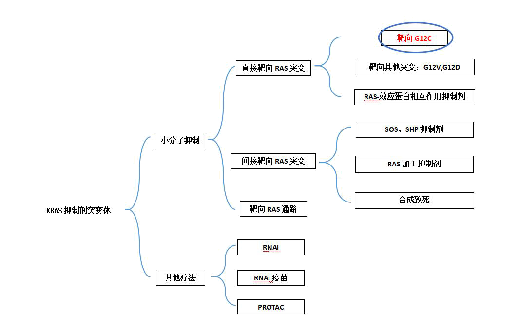 近年来,针对 KRAS突变体的共价抑制剂研究的突破性的进展,这使得 KRAS突变体可以通过异构位点(allosteric)靶向 KRAS突变体成为可能。KRAS G12C突变体中,与突变体的胱氨酸共价结合的小分子更倾向与GDP结合的KRAS蛋白相结合。而且这种结合降低了 KRAS与 GEF的亲和力,同时阻止 GEF催化 GTP替换GDP,将KRAS G12C突变体锁定在失活状态。在KRAS G12C突变体上发现的这个“口袋”导致许多小分子共价靶向KRAS G12C突变。