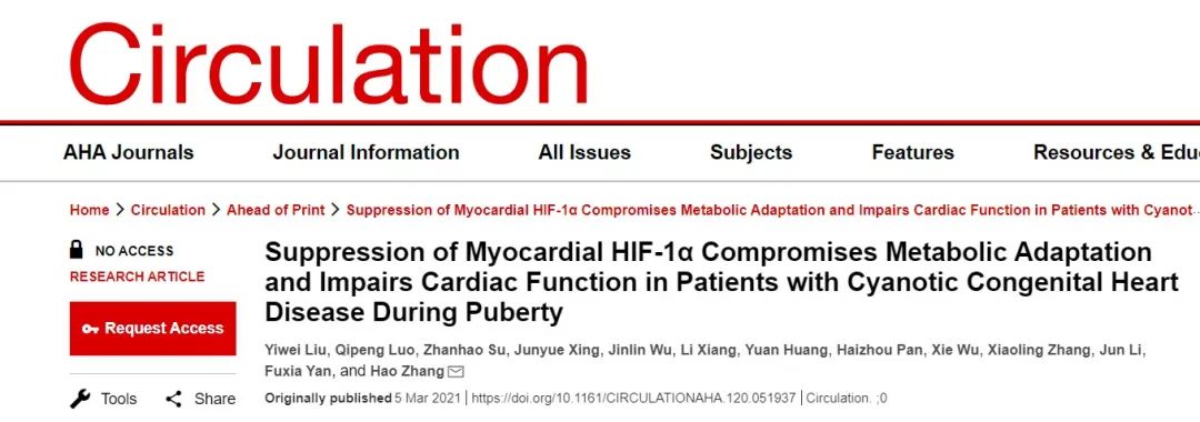 近日,上海儿童医学中心张浩课题组在Circulation期刊行发表了题为“Suppression of Myocardial HIF-1α Compromises Metabolic Adaptation and Impairs Cardiac Function in Patients with Cyanotic Congenital Heart Disease During Puberty”的文章。
