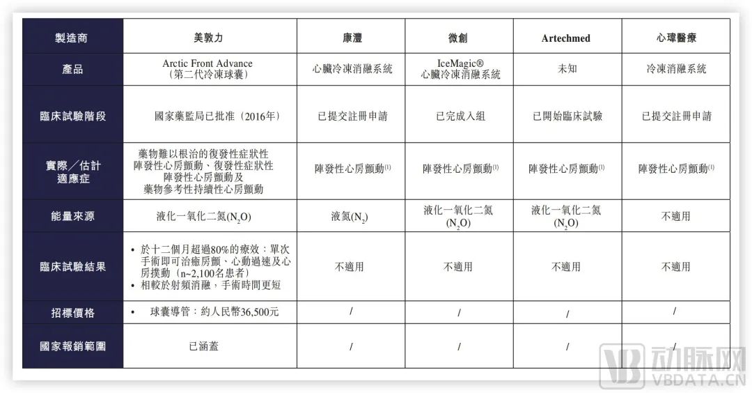 另一款主要在研产品是心脏冷冻消融系统,通过在微创手术中冷冻和破坏导致心律失调的异常心脏组织来治疗阵发性心房颤动。公司已完成心脏冷冻消融系统的多中心临床试验,并于2022年5月发出最终临床试验报告,于2022年7月向国家药监局提交注册申请,预期于2023年第二季度或前后就该在研产品获得国家药监局的批准。中国仅有一款获准商业化用于治疗房颤的冷冻消融器械。基于公开可得资料,康沣生物是中国四家就治疗房颤冷冻消融器械进行临床试验的公司之一,且是唯一一家采用低压液氮进行冷冻的公司。