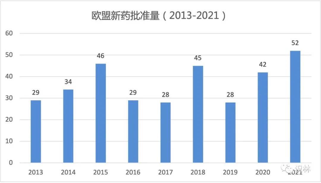 2021 年欧盟批准了创纪录的 52 个含有新活性成分(NAS)的药物,其中包括批准了用于新冠疾病的 4 个新疫苗和 3 个新药。