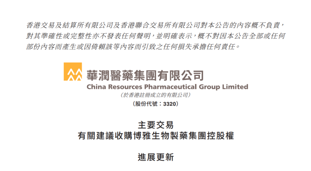 昨日(7月6日),华润医药发布有关建议收购博雅生物制药集团控股权进展更新的公告。