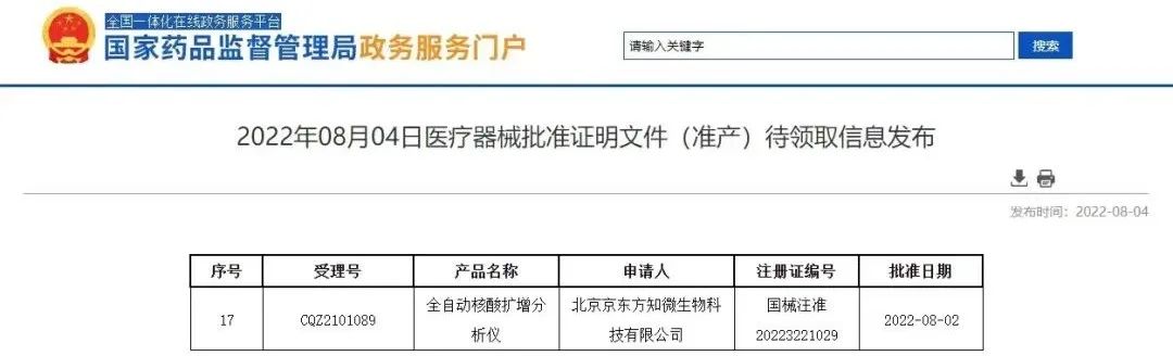 2022年8月2日,北京京东方知微生物科技有限公司自主研发生产的全自动核酸扩增分析仪(型号NAT-3000)获得了国家药品监督管理局(NMPA)第Ⅲ类医疗器械注册证(国械注准20223221029)。