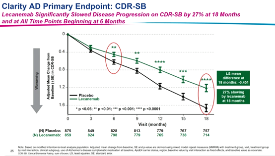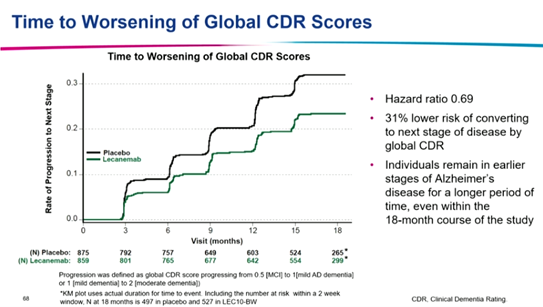 同时根据CDR总分评估,仑卡奈单抗治疗转入下一阶段疾病的风险降低31%(HR: 0.69,图3)。基于CDR-SB斜率分析显示,如仑卡奈单抗持续治疗至25.5月,临床衰退将与安慰剂治疗18月时相当,证实其可延缓疾病进展达7.5个月。